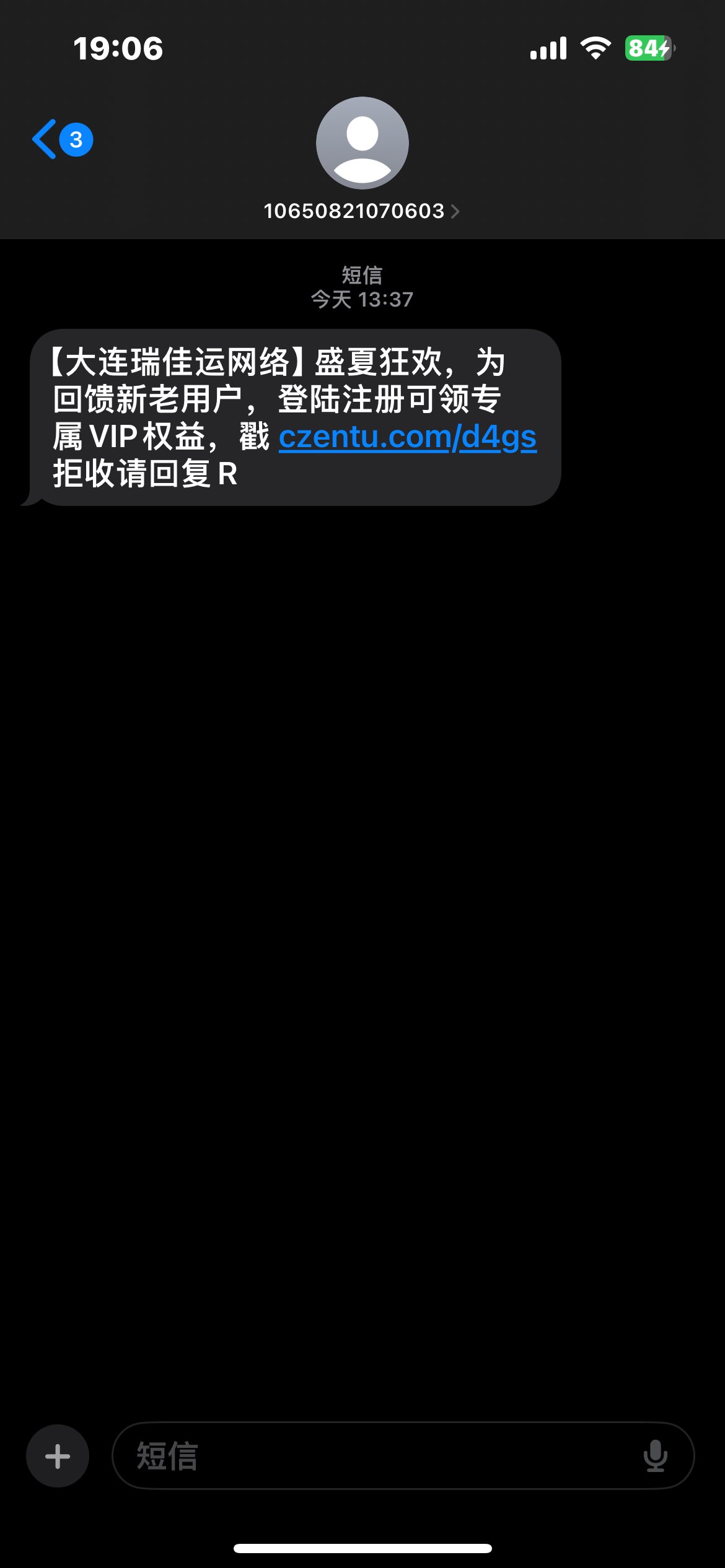 短信链接:【大连瑞佳运网络】盛夏狂欢,为回馈新老用户,登陆注册可领专属VIP权益,戳 czentu.com/0wro 拒收请回复R a333.app 送18 200提,