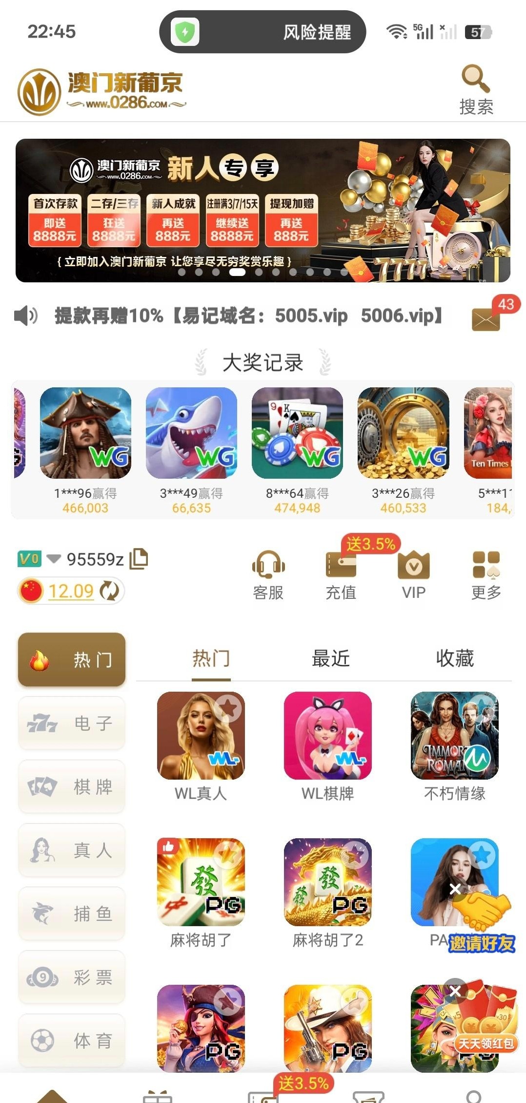 接到电话,找客服送了12,漏接电话的可以去看看,0286.com